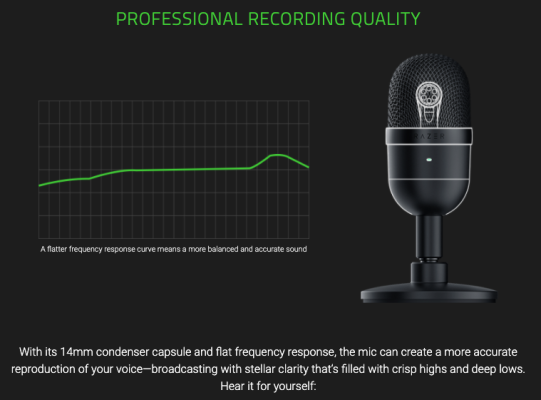 The Razer Seiren Mini has a warmer, balanced sound and picks up less background noise compared to the identically priced Microphone S. Compared to the more expensive Microphone Y, the Razer Seiren Mini is comparable in sound quality with balanced amounts of highs and lows.